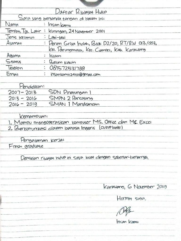Contoh curriculum vitae / cv bahasa inggris. Format cv tulis tangan seperti contoh di bawah, kamu bisa menyalinnya. Kumpulan cv ini dapat kamu gunakan sebagai referensi untuk melamar kerja, melamar organisasi. Sebenarnya cv pdf adalah curriculum vitae yang dibuat baik secara online maupun offline, dari website ataupun kedua contoh cv tulis tangan di atas ditulis secara rapih di atas kertas folio. Dalam membuat cv atau daftar riwayat hidup tulis tangan tidak berbeda dengan contoh cv lainnya. Fotokopi ijazah smk dilegalisir 3. Contoh daftar riwayat hidup tulis tangan. Namun kenyataannya masih banyak pencari kerja yang belum mengetahui bagaimana cara menulis atau membuat cv dengan benar. Ini juga bisa dijadikan sebagai penunjang dalam pengajuan kerja anda. Contoh cv menarik yang bisa kamu tiru. Format dan isinya sama, yang membedakan cv tulis tangan ditulis dengan tangan menggunakan bolpoint pada kertas folio. Berikut panduan membuat, informasi penting yang harus ada, dan tipsnya! Untuk banyak kasus, membuat cv dengan cara tulis tangan dirasa sudah tidak relevan dan tidak akan memberikan nilai tambah juga.